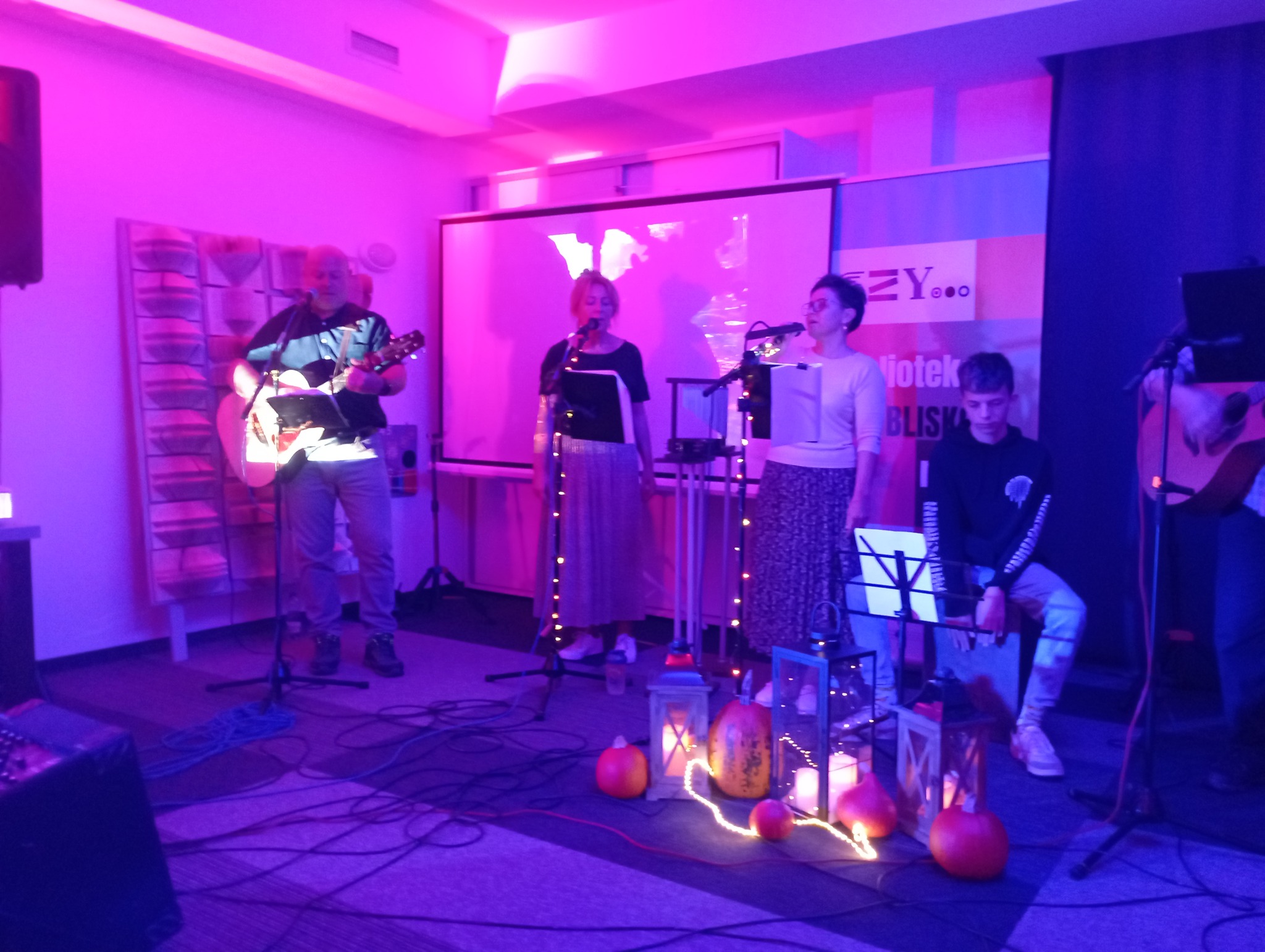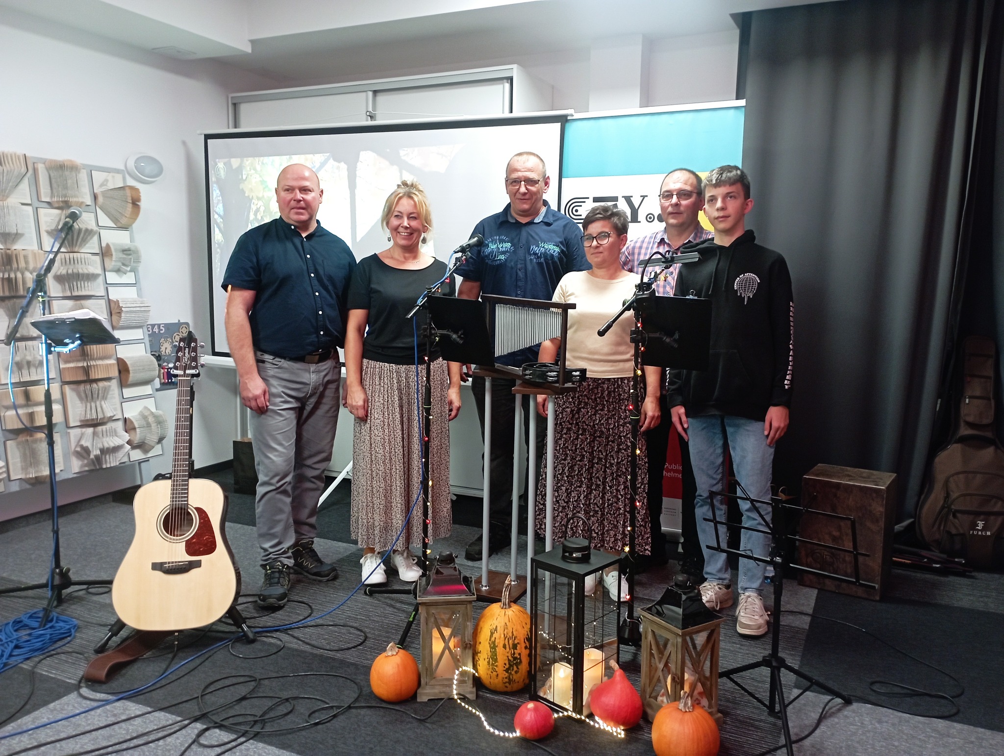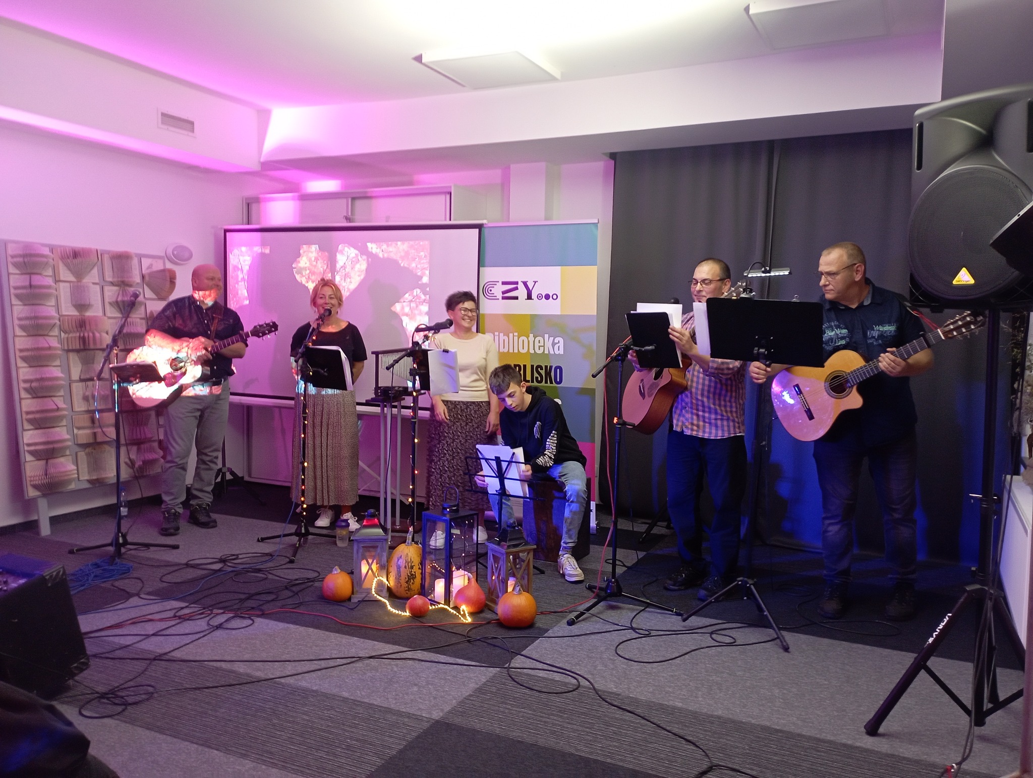 Oto podsumowanie ostatniego koncertu z cyklu "Tacy byliśmy jeszcze wczoraj – czyli muzyka słowem pisana," który odbył się w ramach zadania „Biblioteka BLISKO nas” w Biblioteka Publiczna MOKSiR w Chełmku. Wydarzenie miało nostalgiczną i piękną atmosferę, idealnie wpisując się w jesienny klimat. W koncercie wystąpili lokalni artyści, prezentując repertuar pełen emocji, wspomnień i muzycznych wzruszeń. Na scenie pojawili się Aleksandra Buda, Agnieszka Znaleźniak, Krzysztof Omyła, Tomasz Buda, Zbigniew Dębski, Maciej Omyła oraz Andrzej Znaleźniak.