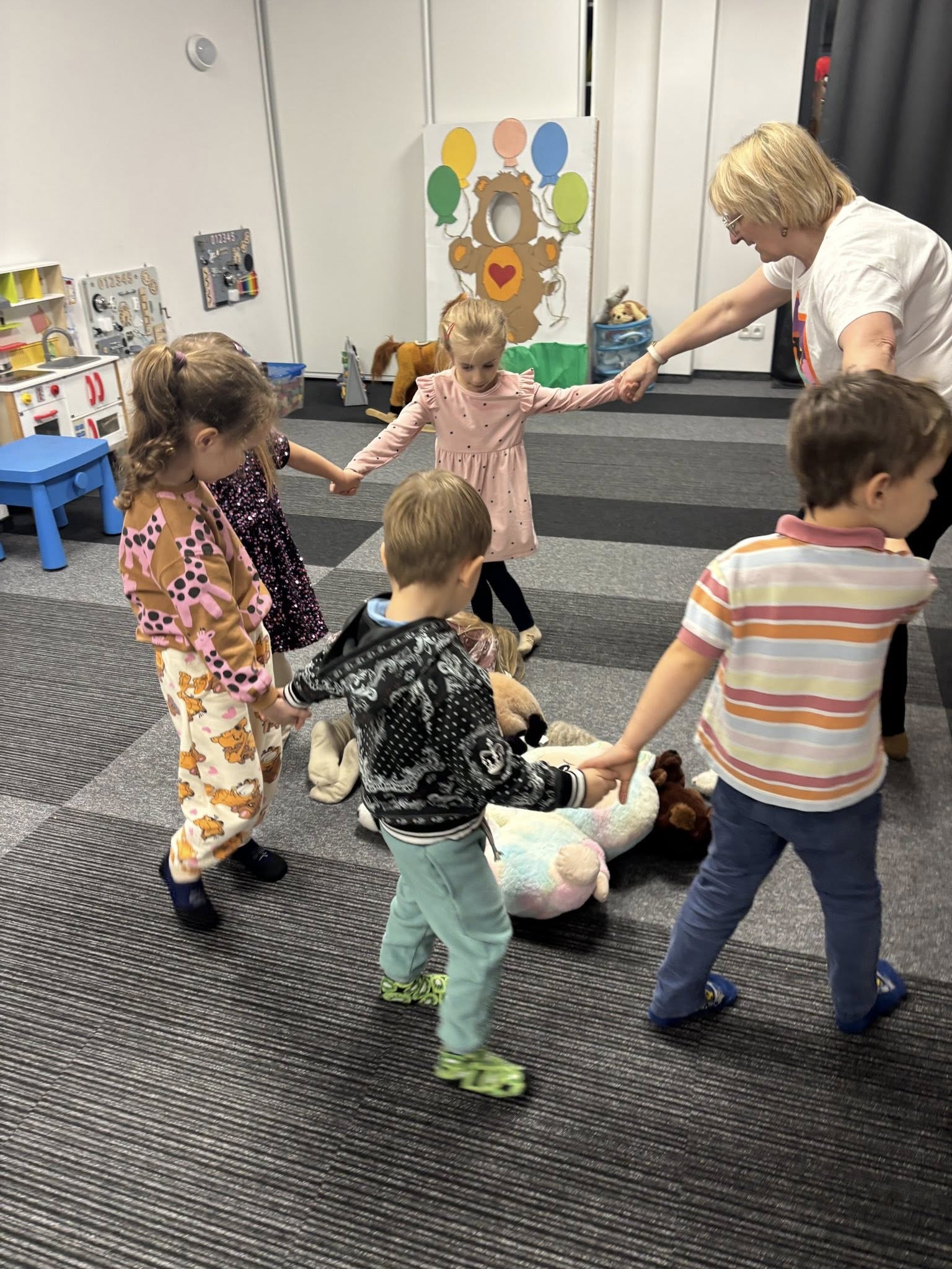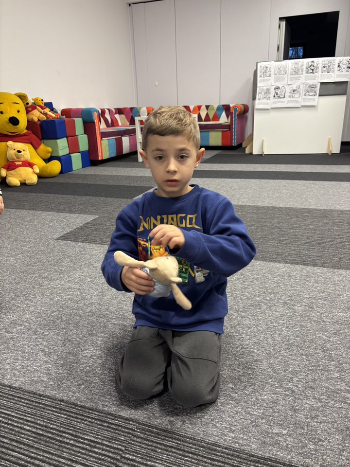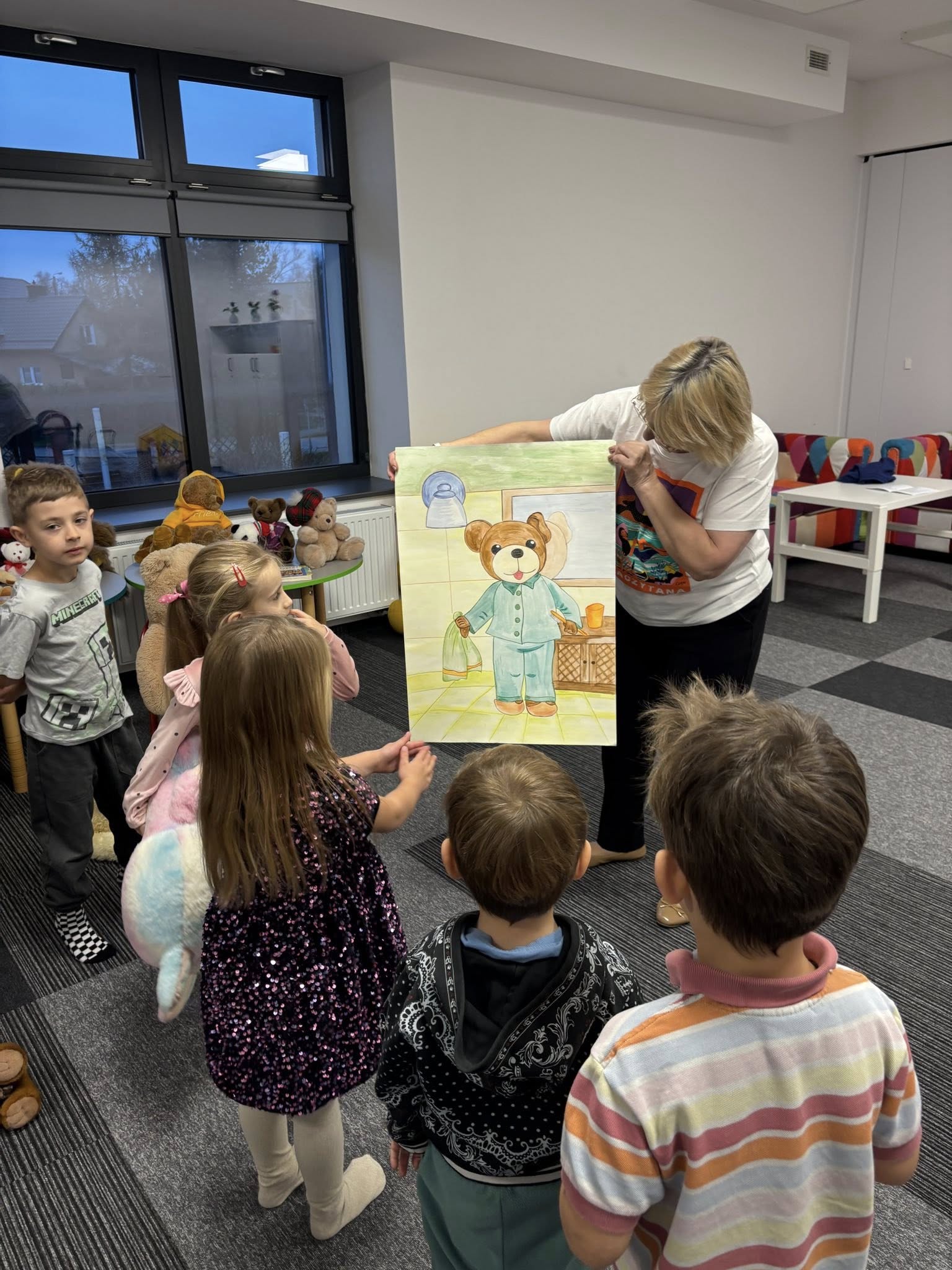 Dzieci wysłuchały pięknej historii o misiach, bawiły się w „niedźwiedzia”, rozwiązywały zagadki i tańczyły przy wesołych piosenkach. Rozmawialiśmy także o najsłynniejszych misiach świata, od klasyków z bajek po bohaterów książek.