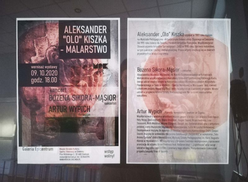 Miejski Ośrodek Kultury i Sztuki w Chełmku zaprasza na otwarcie wystawy malarstwa Aleksandra -„Olo”- Kiszki oraz koncert duetu Bożeny Sikory – Mąsior (saksofon) oraz Artura Wypicha (fortepian)