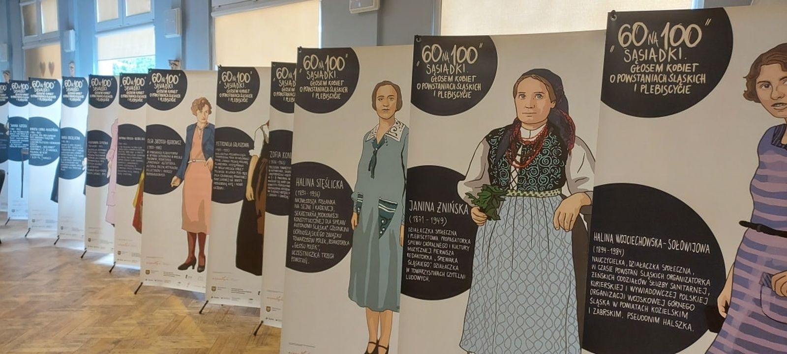 Wystawa „60 na 100. SĄSIADKI. Głosem Kobiet o powstaniach śląskich i plebiscycie„, przedstawia w skali 1:1 trzydzieści bohaterek z przełomu XIX i XX wieku, związanych z historią regionu. Poświęcona mało znanym bohaterkom wypełnia lukę w opowiadaniu historii Górnego Śląska, gdzie nieobecność kobiet nie jest przypadkowa. Tradycyjnie opowiadana historia nie dostrzega zbyt wielu kobiet. Wolelibyśmy myśleć, że historia nie ma płci i zapewne tak jest. Jednak dominującymi postaciami opisów historycznych są mężczyźni. Wystawa Sąsiadki przełamuje ten kanon. Spojrzenie na wielką i małą historię oczyma kobiet powoduje, że inaczej rozkładamy akcenty. Uruchamiamy opowiadanie o tym, co nie tylko nieznane, ale czasem wyparte i schowane głęboko w kobiecej zbiorowej i niestety – niewypowiedzianej – pamięci. Wojna, czy powstanie zapamiętane przez kobiety, to obraz inny niż męskie wspomnienie. Codzienność, drugi plan „wielkiej historii” przez lata wydawał się tematem mało ważnym dla badaczy, muzealników, czy interpretatorów dziedzictwa. A nawet dla samych kobiet, przez pokolenia. Dlatego nie przeczytacie o bohaterkach wystawy w podręcznikach do historii. W wielu oczach nadal nie jest bohaterstwem samotne zajmowanie się domem, wychowanie czeladki dzieci, bycie powstanką, sanitariuszką, kurierką, czy mówczynią propagandowych wieców, albo np. lekarką frontową, czy liderką ruchu kobiecego