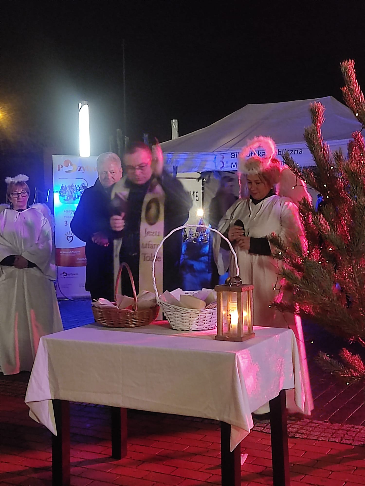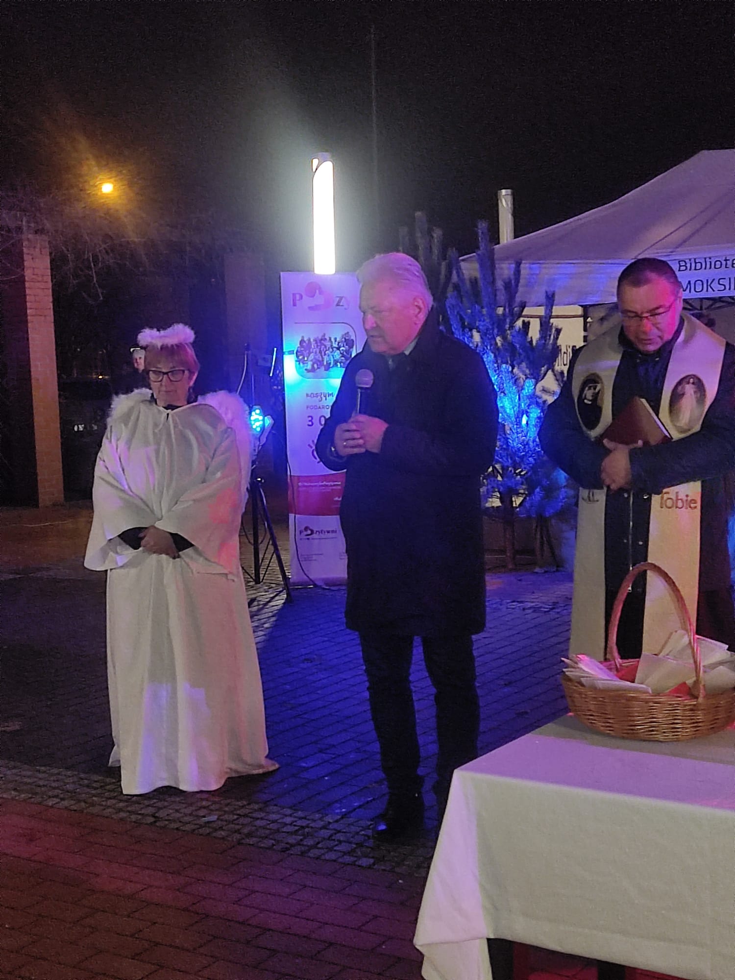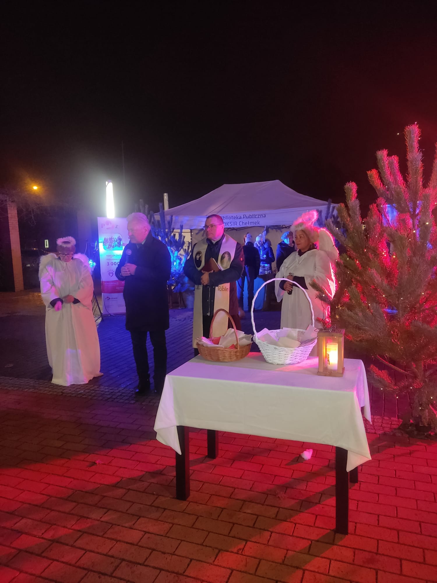 Powróćmy do piątku 15 grudnia, gdzie na Placu Wolności przed siedzibą Biblioteka Publiczna MOKSiR w Chełmkuodbył się 3. Jarmark Świąteczny w Chełmku połączony ze spotkaniem opłatkowym. Andrzej Saternus Burmistrz Chełmka o godzinie 17.00 złożył na nadchodzące święta Bożego Narodzenia oraz Nowy Rok życzenia wszystkim mieszkańcom oraz przybyłym gościom. Ks. Piotr Modelski poświęcił opłatki, którymi łamiąc się składaliśmy sobie życzenia. Dzięki obecności pani Aleksandry Szklarczyk Komendantce Związek Drużyn Chełmek im. Bohaterów Westerplatte była możliwość odpalenia na placu Betlejemskiego Światła Pokoju, które harcerze przywieźli do naszego miasta. Był to także czas na zakup lokalnego rękodzielnictwa, świątecznych upominków dla bliskich. Na uczestników tego dnia czekała ciepła herbata, bookcrossing i ognisko, a także tradycyjny poczęstunek barszcz z krokietem. Dzięki współpracy z Nadleśnictwem Chrzanów, kilka pięknych ekologicznych choinek trafiło do mieszkańców. Dostępny był także Gminny Punkt konsultacyjno-informacyjny Programu Czyste Powietrze.
