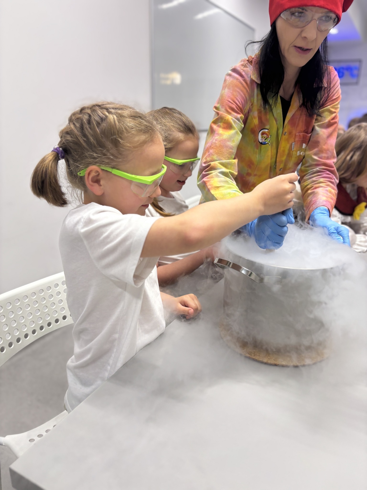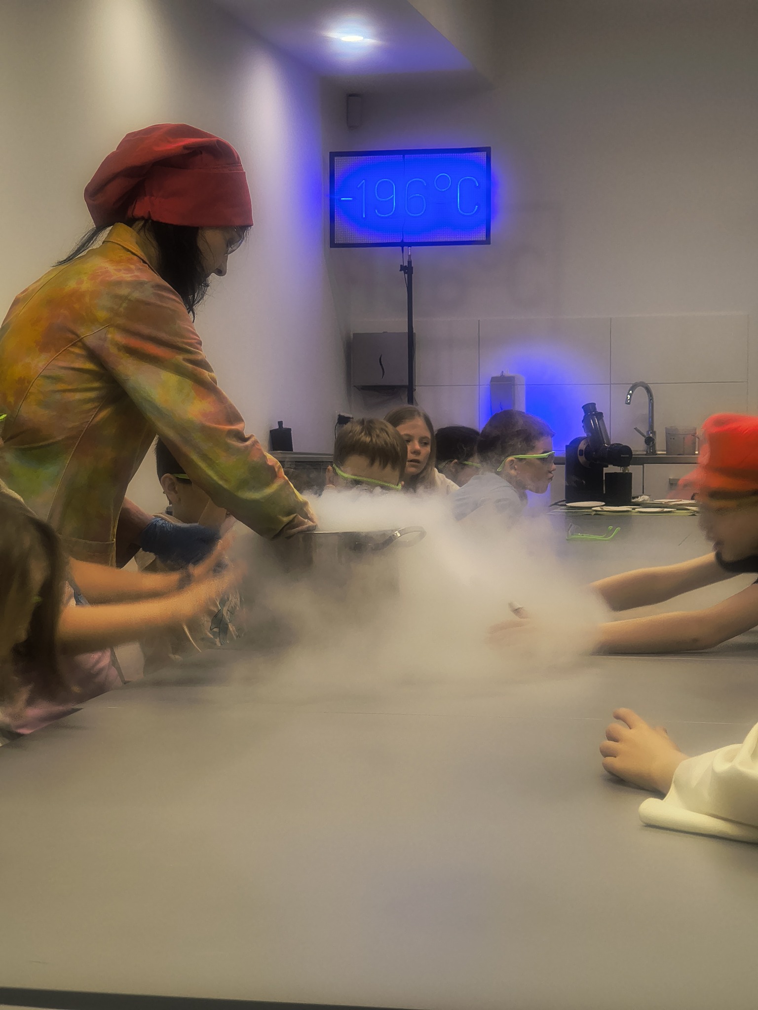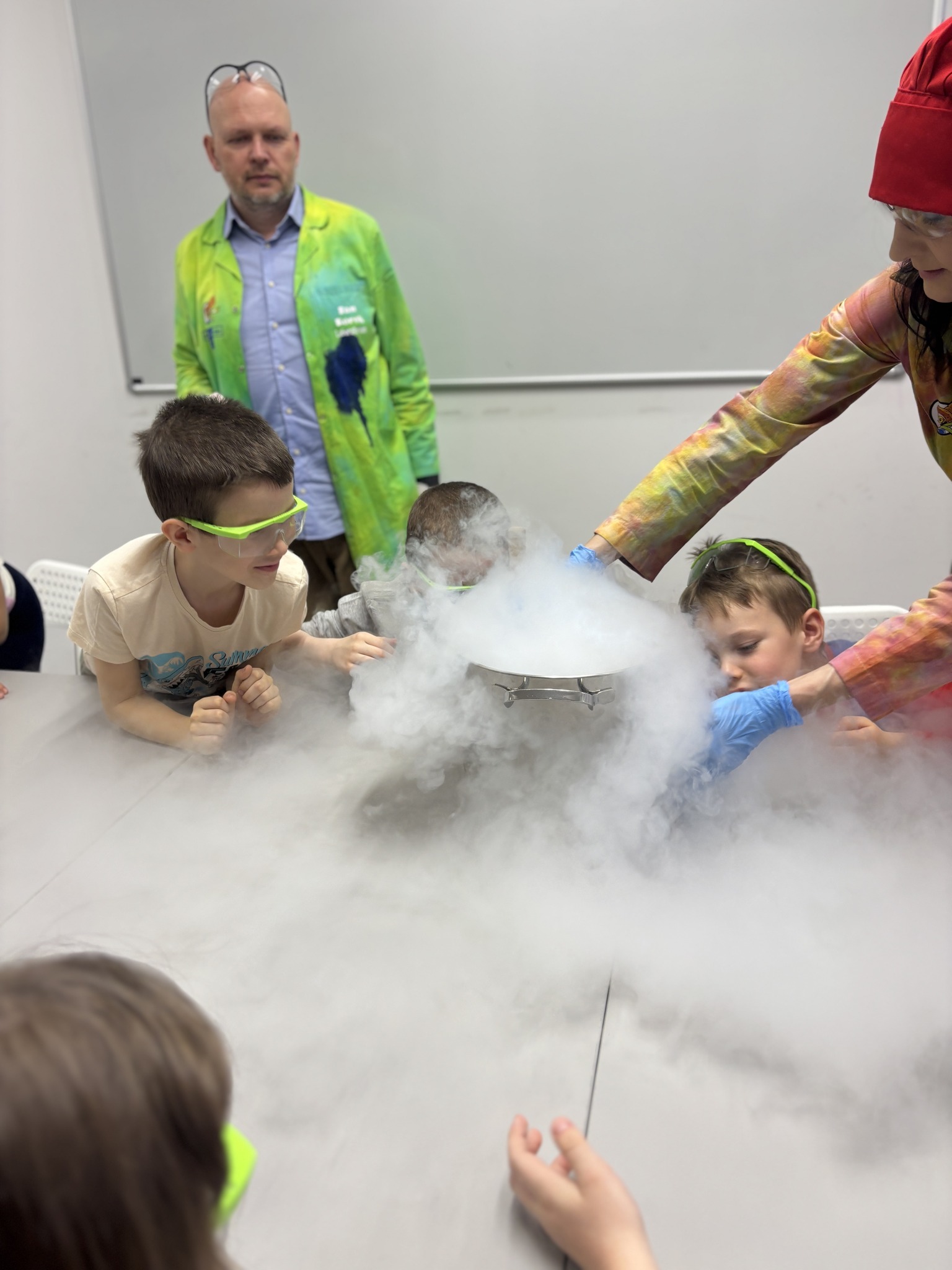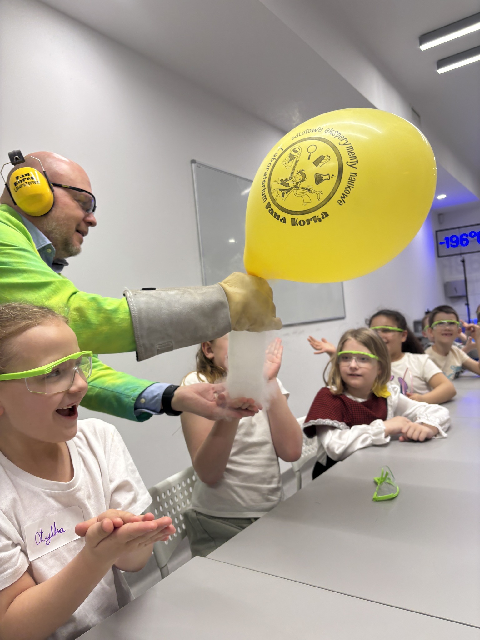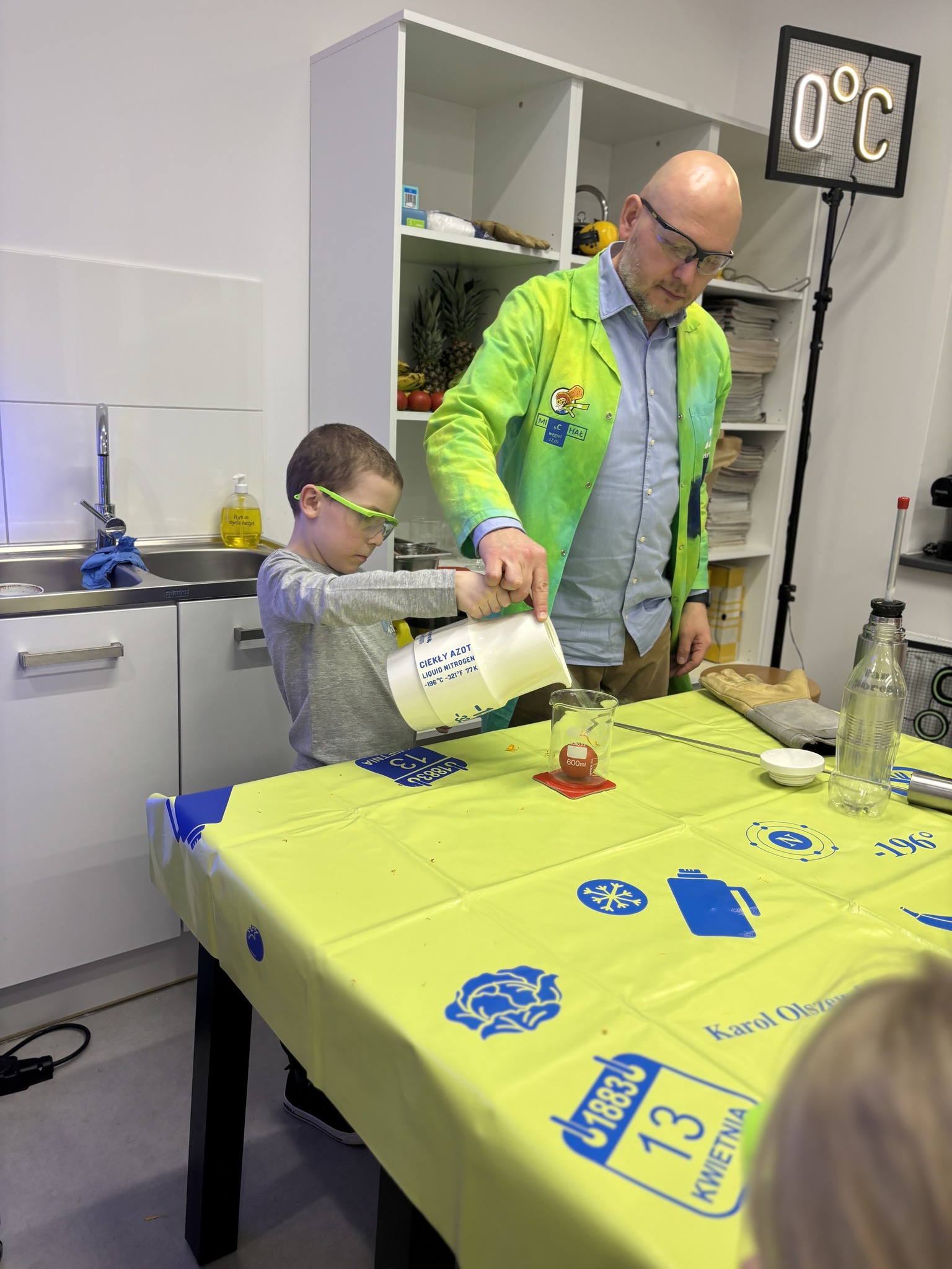 Dzięki wsparciu Urzędu Miasta i pana Burmistrza Chełmka Andrzeja Saternusa dzieci mogły uczestniczyć w wyjątkowych warsztatach popularnonaukowych z elementami profilaktyki, które dostarczyły dzieciom nie tylko nowej wiedzy, ale także ogromu radości i fascynujących odkryć. Młodzi uczestnicy mieli okazję eksperymentować m.in. z ciekłym azotem, zadawać pytania i zgłębiać tajemnice nauki w przystępny, pełen pasji sposób. Prawdziwą sensacją okazało się robienie lodów w ekstremalnie niskiej temperaturze – były one nie tylko zdrowe, ale także bez dodatku cukru i konserwantów. Nie zabrakło również elementów baśniowej zabawy i integracji. Julia Dworniczek i Gosia Legut w ramach realizacji służby harcerskiej związanej ze stopniem harcmistrza, przygotowały zagadki i animacje inspirowane literaturą Andersena, które rozbudziły w dzieciach wyobraźnię i wciągnęły je w fascynujący świat baśni.