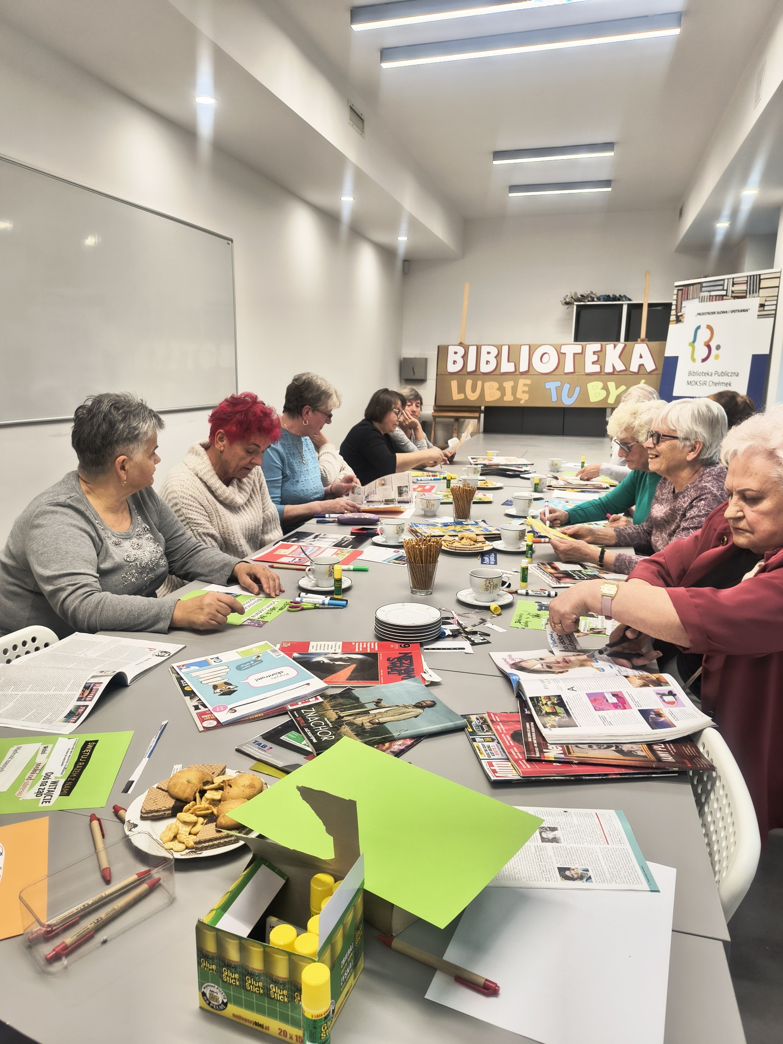 W ramach obchodów Tygodnia Bibliotek 2025, upływajacych pod hasłem „Biblioteka – lubię tu być”, w Biblioteka Publiczna MOKSiR w Chełmku odbyły się warsztaty kreatywno-literackie z seniorami. Uczestnicy spotkania stworzyli wyjątkowe słowne kolaże z fragmentów tekstów wyciętych z gazet, odpowiadając na pytanie: dlaczego lubią być w bibliotece?