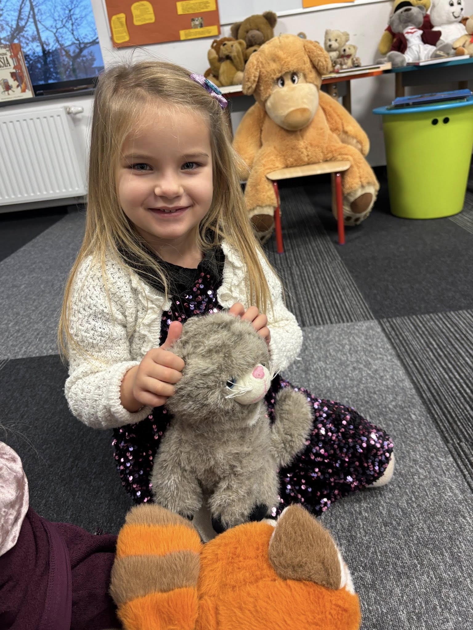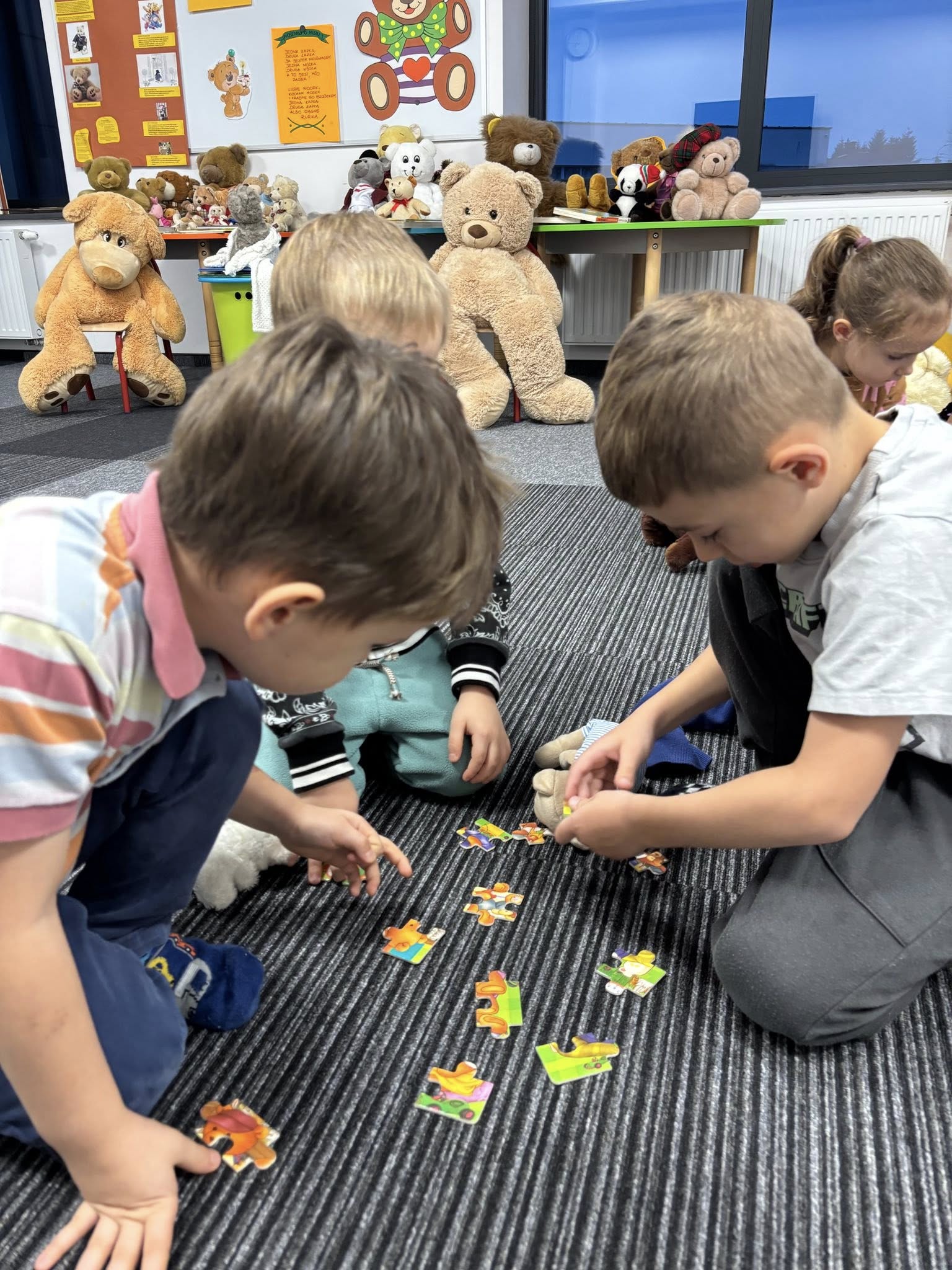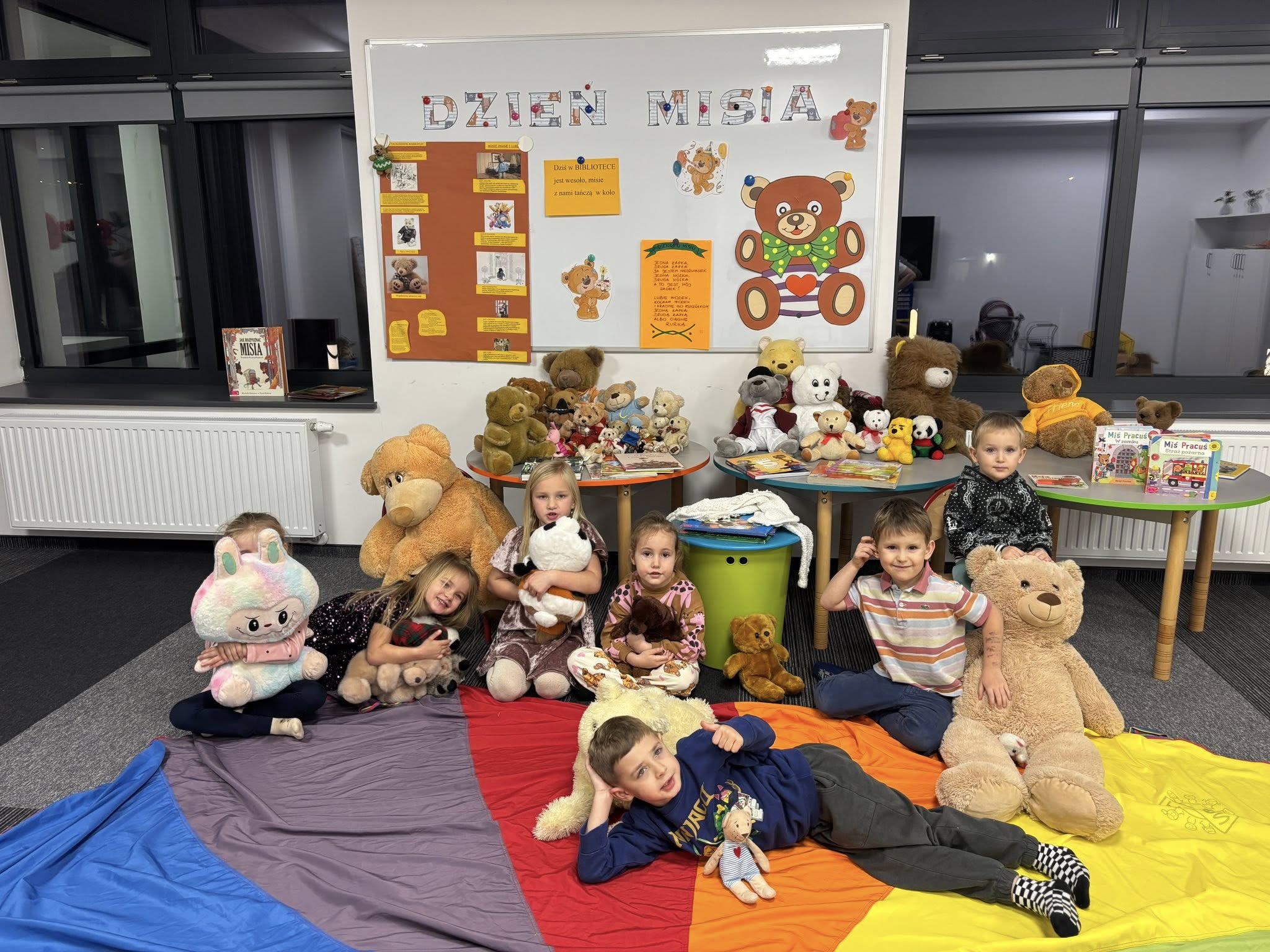 Dzieci wysłuchały pięknej historii o misiach, bawiły się w „niedźwiedzia”, rozwiązywały zagadki i tańczyły przy wesołych piosenkach. Rozmawialiśmy także o najsłynniejszych misiach świata, od klasyków z bajek po bohaterów książek.