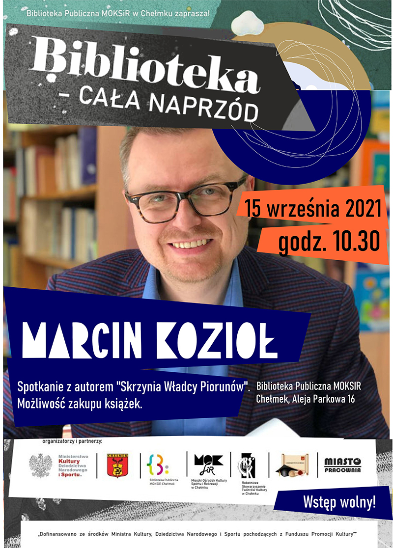 Biblioteka Publiczna MOKSIR serdecznie zaprasza na spotkanie autorskie z Marcinem Kozłem autorem "Skrzynia Władcy Piorunów"